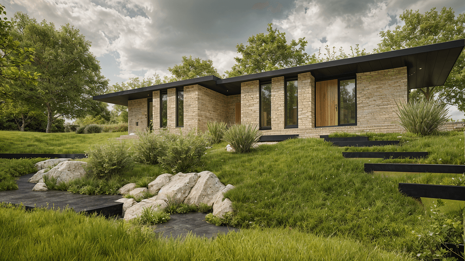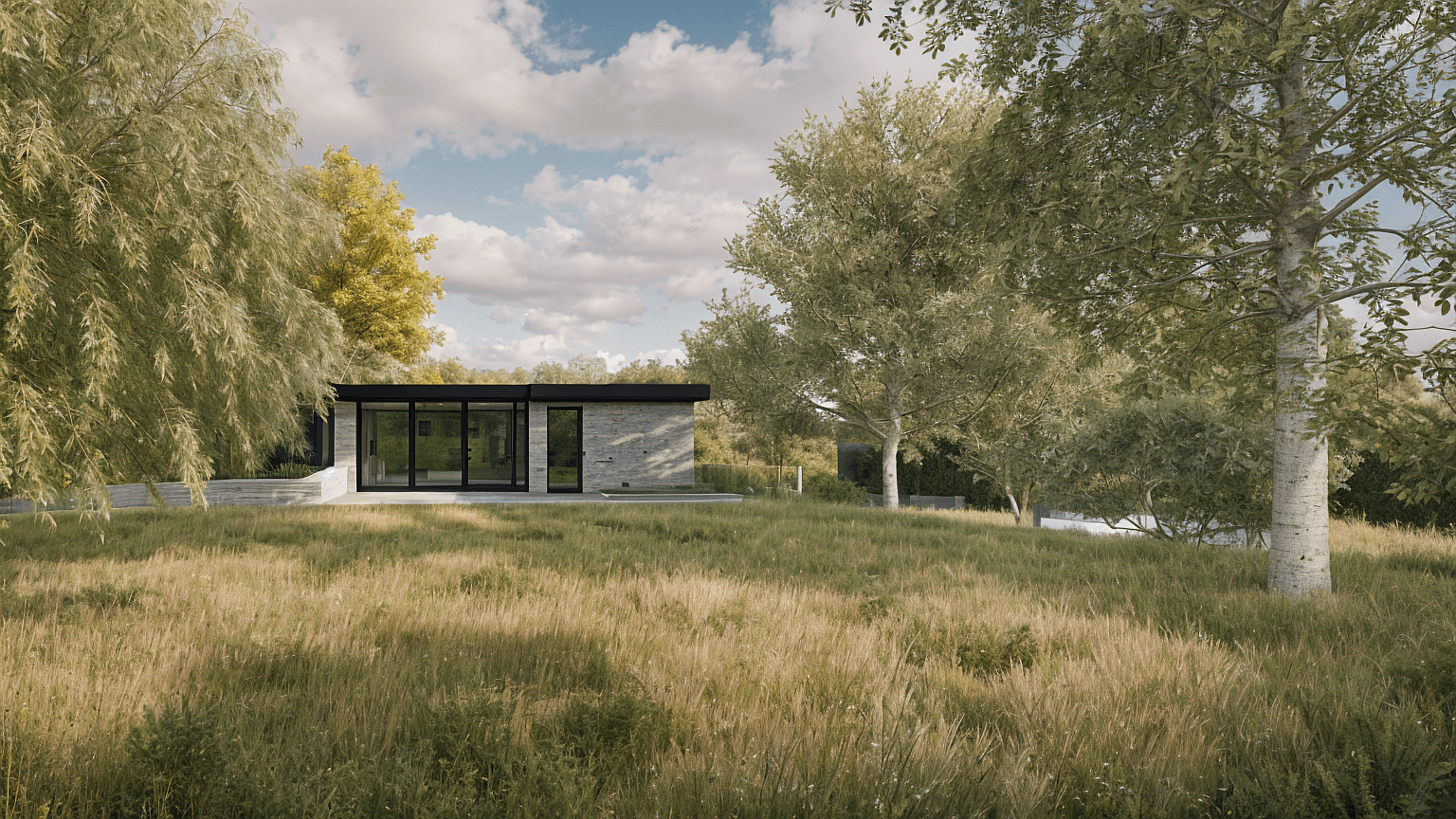 Before: A clean architectural Gendo render showcasing the modern home in a quiet natural setting, focused purely on form, light, and landscape.