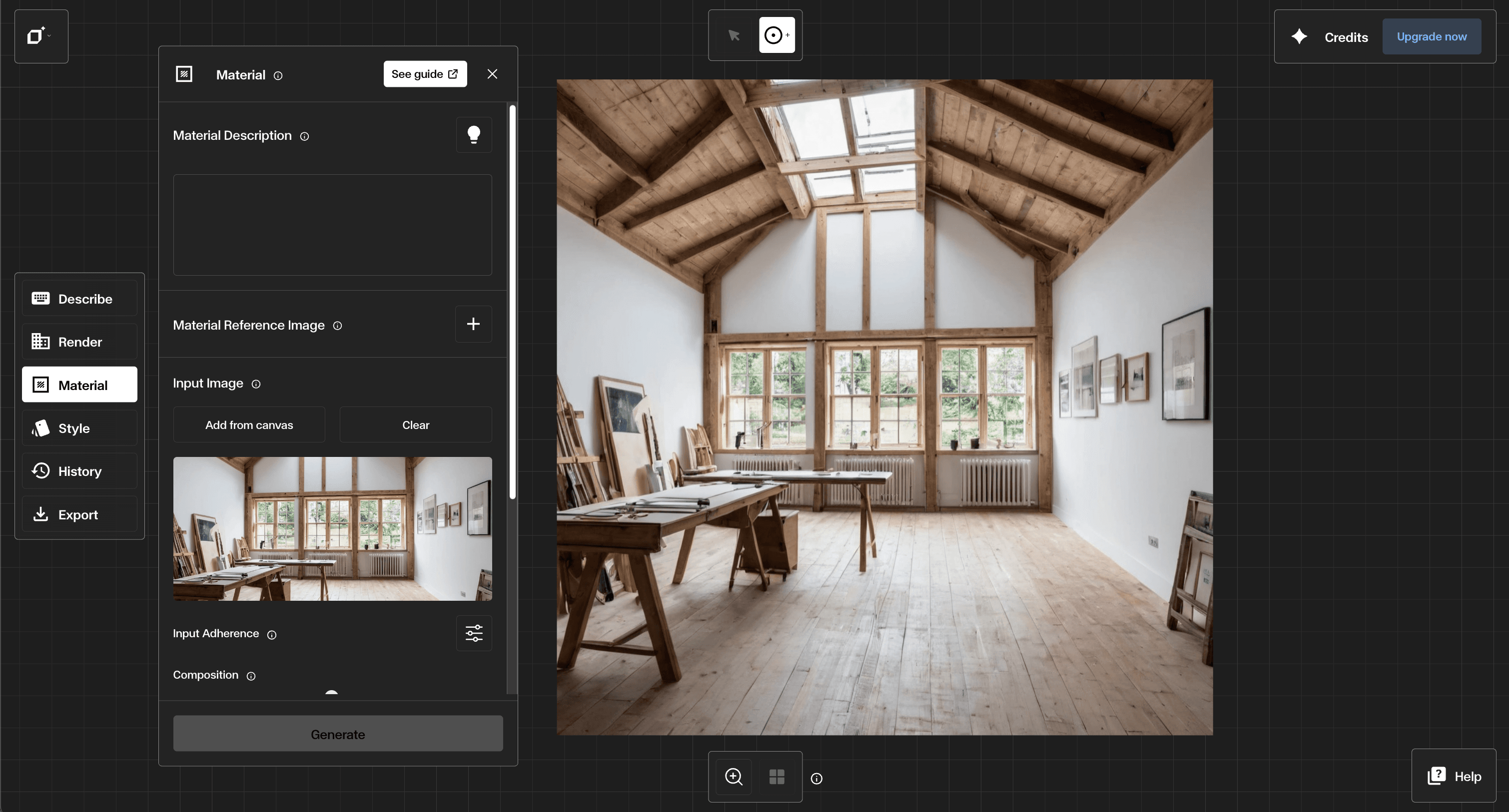The Render Tool helps you create accurate visualizations of your designs. For this example, we'll upload a screenshot of our SketchUp project into the Input Image box.